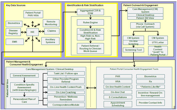 The Diagram in the Figure below shows how Lambdanets plans to achieve the Population Risk Management. The data obtained from the key patient data sources is analyzed to create a patient-risk stratification where high risk patients can be quickly identified. These patients are then entered into the Care Management System. The patient outreach and engagement will create patient profiles with a 360 degree view of the patient’s health. The patient management and consumer health engagement provides a Patient Portal, where patients can see information related to their health and the care coordinators will be able to monitor and assess patient’s health and design a personalized plan of care.